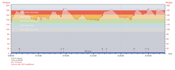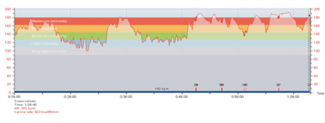 So I put a Heart Rate monitor on Miss Chivas from the Rock Mobsters  and simply wrote down when she did some efforts and then looked at the download. Now as we know Heart Rate is a pretty poor reflection of the physiological demands of Roller Derby. Lots of sports science gadgets now exist that give insight into impact forces, acceleration patterns etc but hey this is a start. That will come.