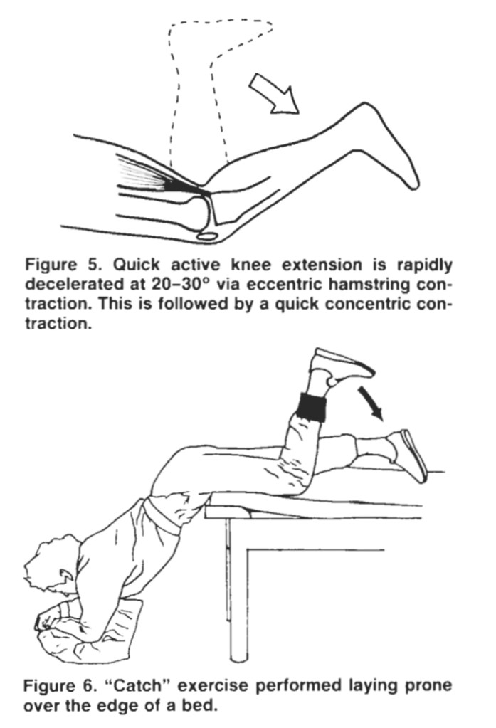 In a 1989 article, Craig Purdam and Peter Stanton introduced the hamstring catch but slightly different to the 2021 study. This study looks a lot more like tantrums but is still eccentric given the catch. In the study there was information on the forces and speed of the exercise. The exercise could be done prone and also lying over a table. And involved high speed “catches” starting with bodyweight but often ending with 5 kilogram ankle weights. I actually used this exercise a lot in rehabilitation with successful outcomes at return to play. (Caveat is many factors make up a successful RTP).