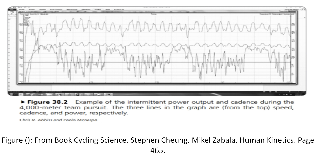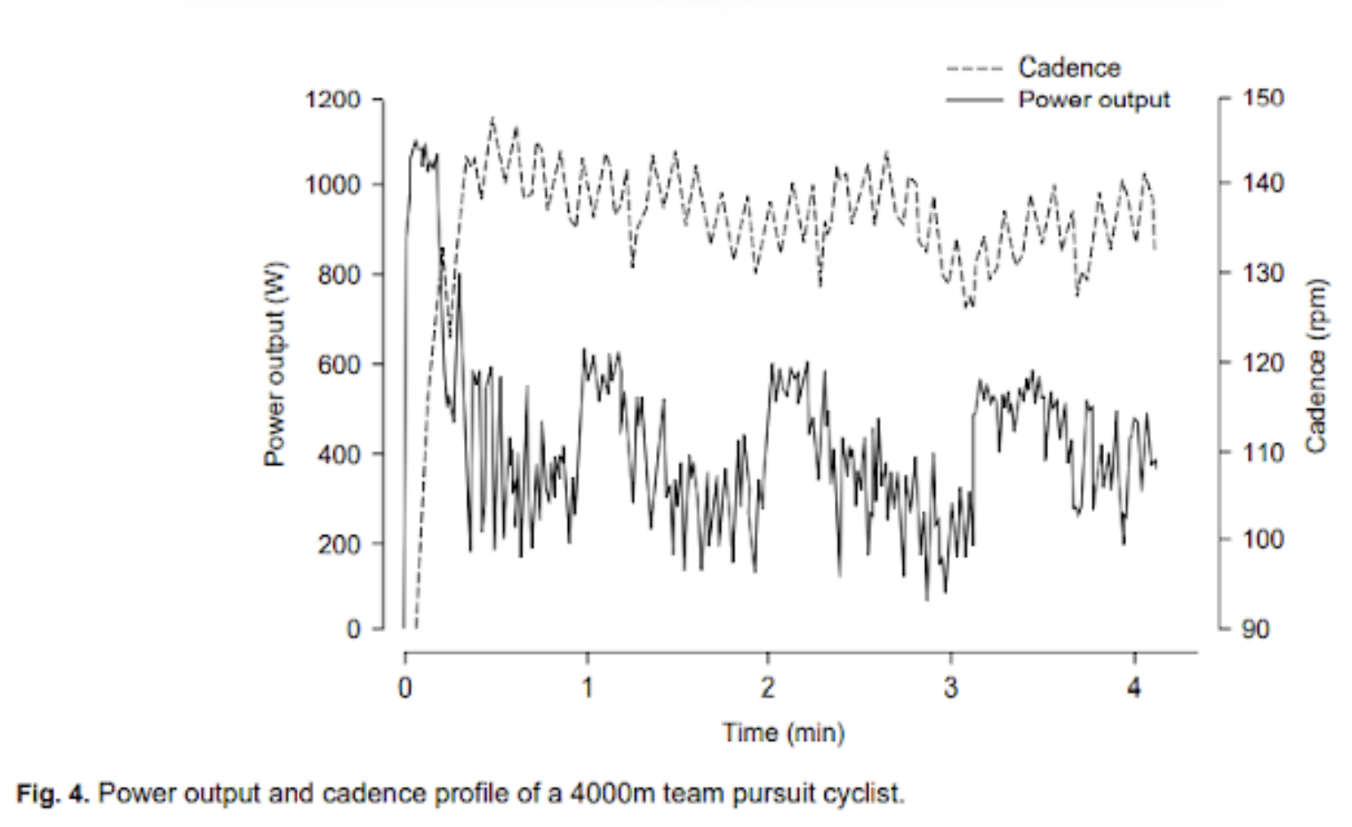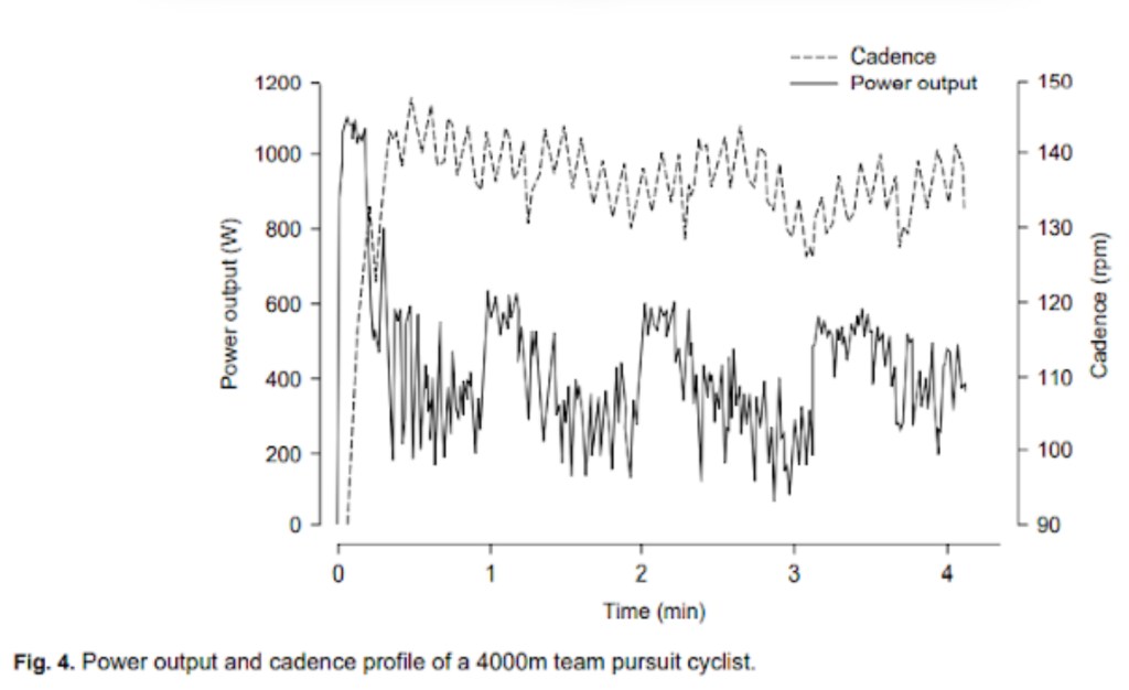Graph (1) is from a 2001 World Cup Team Pursuit Race. The time was just over 4 minutes. Despite the world record being 3:42 now, 4 minutes is still a good time for many teams in 2021. So even in 2001, the event required power outputs were in excess of 1000 watts at the start. (Characteristics of Track Cycling: Sports Med 2001; 31 (7): 457-468. Norton and Craig.)