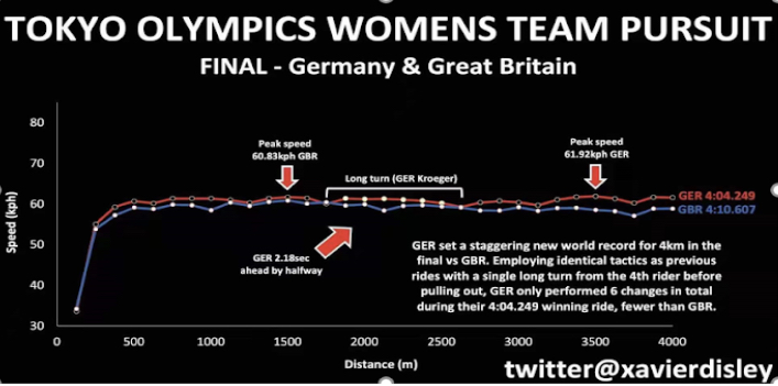 Graph (3) is a speed graph split into 30 second intervals. It is of the German Women’s team at the 2021 Tokyo Olympics. This graph highlights the female cyclist leaving the team at 2700 metres after several laps in front. She also started the race. So huge demands for her given she was number 1 at the start. Then spending a long time in front before leaving the team, impose huge demand on her energy. (Graph from B Xavier Disley, PhD (@xavierdisley) / Twitter. He is an aerodynamics expert.)