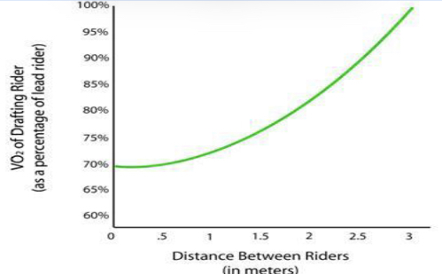 The tactics and strategies of how to maximize individual cyclists capabilities have been studied via mathematical modelling (9). In a paper published in 1998, Tim Olds established the relationship between the proximity of two cyclists and the VO2 savings gained by the trailing rider (10). (see graph below). He found that benefits of spacing can be as large as 14.1 per cent with a gap of 0.2 m and as low as 6.8 per cent with a gap of 2 m. Significant benefits occur as long as the gap between riders is less than 3 m. There were many crashes at the Tokyo 2021 Olympics Team Pursuit competition. One opinion was that teams were both trying to minimise space between wheels and also keep their heads down to minimise air resistance, contributing to crashes.