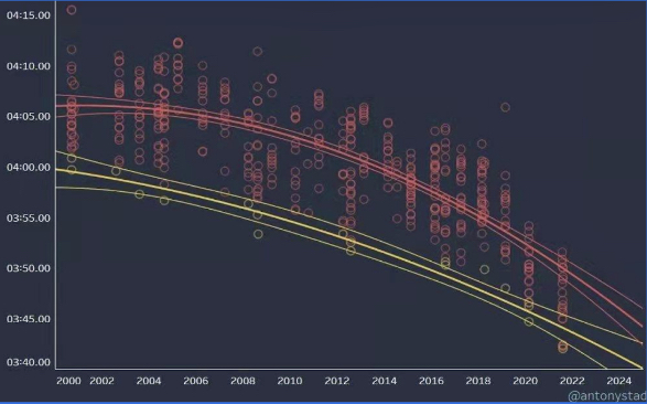 There has been a rapid improvement in the last 3 years in performances. Graph below is a record of race times since 2000 Olympic Games. Since 2004 the World Record has improved by 15.2 seconds. Half of that occurring in the past 3 years and a historically large improvement in 2021.