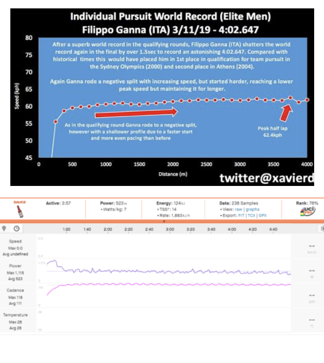 The individual pursuits are 4 kilometre for men and 3 kilometre time trials for women. Huge power output is required at the start of these races. The cyclist has to accelerate smoothly with good technique to conserve energy. Recently in an internet article Ashton Lambie outlined his outputs in winning the World 4 kilometre championship in France 2021. He used 65×15 gears or 117″ gear (52) and averaged 14.8 second laps. The graph below on the left is the speed graph of Filippo Ganna world record of 4:02.647 in 2019. Below is Ashton Lambies power statistics from the 2021 World Championships. Totally different methods used by these cyclists.