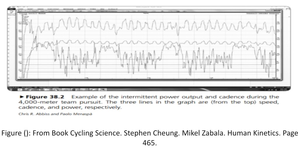 These power outputs are well above the athlete’s aerobic limits. This requires the use of the anaerobic energy pathways (ATP-PC and glycolysis). But given the intermittent nature of the events and the duration also, performance depends a lot on the cyclist’s aerobic capacity (41). The interplay of aerobic and anaerobic capacities is critical in track endurance cycling. There are other factors involved in track endurance cycling performance such as lactate kinetics, anaerobic threshold power, critical power and exercise economy. But it is important to recognize the intermittent nature of these events. Below a recent power curve of an elite team pursuit team represents this clearly.