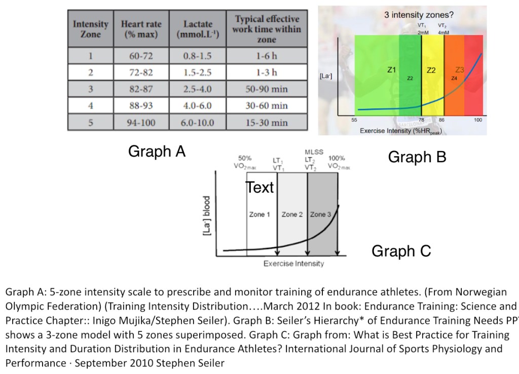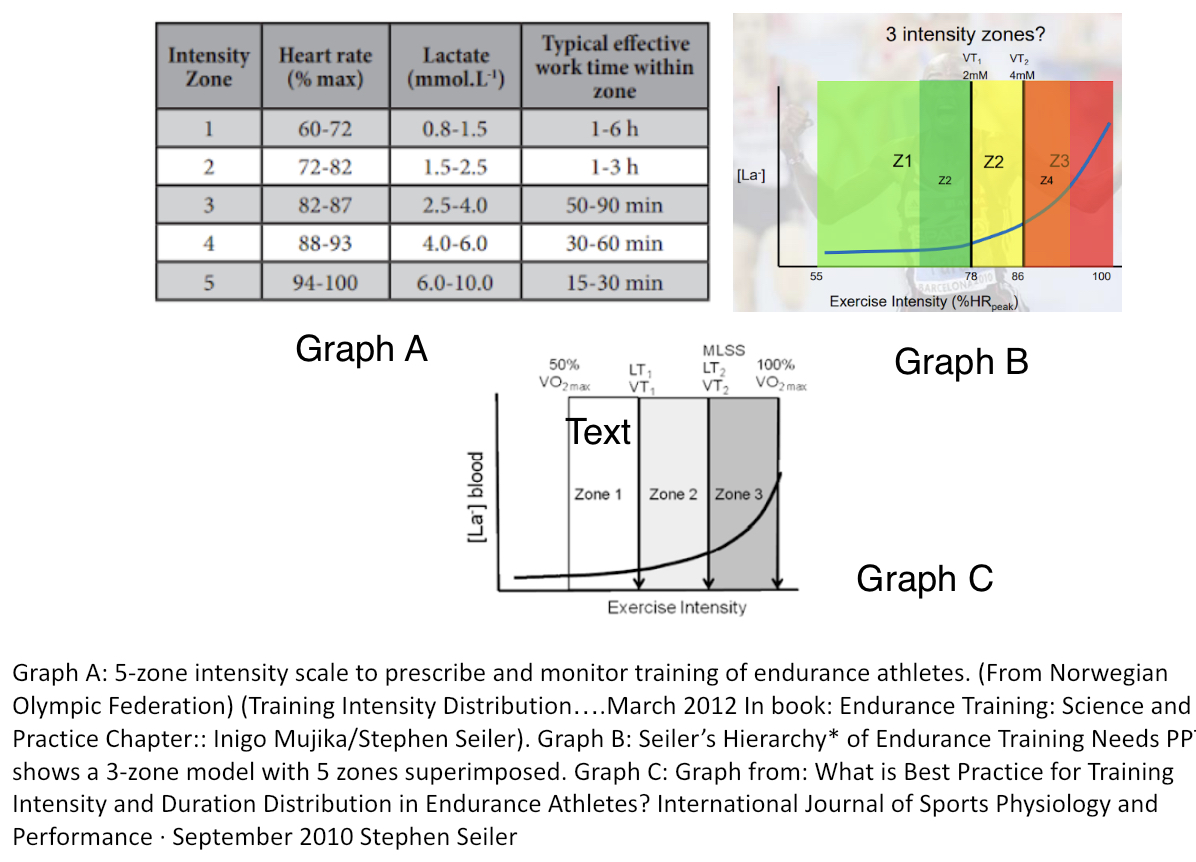 Testing to assess training zones and to prescribe specific exercise prescriptions for the individua cyclists is needed for a training program. The gold standard in the laboratory is the Maximum Oxygen Uptake Test. Here the 2 ventilatory thresholds can be estimated and also maximal aerobic power. And these ventilatory thresholds, are often of greater significance in Track Endurance Cycling than the Maximum Oxygen Uptake Scores (42). Added is the maximal heart rate and other information of power data at stages of the test. Zones can then be created to prescribe training. Below are 3 zone and 5 zone models used by the Norwegian Olympic Federation to quantify Training Intensity Distribution. Elite athletes generally use a 5-zone model to prescribe training, whilst sub elite use a 3 zone model. (Note research studies also use a 3 zone model).