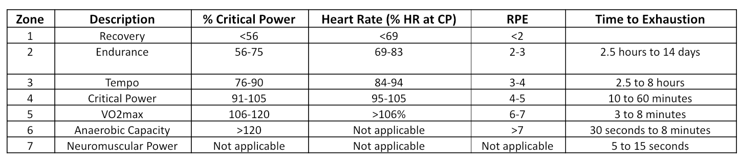 Polarized training is widely used in track endurance cycling training. (30) (32) (33). Polarized training involves doing a large volume of aerobic work, avoiding the middles zones of training, and then doing quality training at high intensity. This concept has been commercialized as 80/20 training. It is considered that too much training at moderate intensity (Zone 2 in a 3-zone model or Zone 3 in a 5-zone model) is fatiguing, but does not provide adequate fitness gains. For elite cyclists who train with high volumes, this can result in a cyclist who is then fatigued for subsequent high intensity sessions. These high intensity sessions are important because they drive specific adaptations. This extends to using Zone 6 for maximal anaerobic sprint interval training to improve capacity. And neuromuscular efforts (Zone 7) at maximal intensity of short duration, to build power and speed. Using Critical Power testing, the table below demonstrates how a cyclist could use the zones to apply the polarized training model. Depending on the testing protocol these zones can vary a little. For example if a cyclist uses the standard 20 minute FTP test they would use zones developed by Allen and Coogan (54).