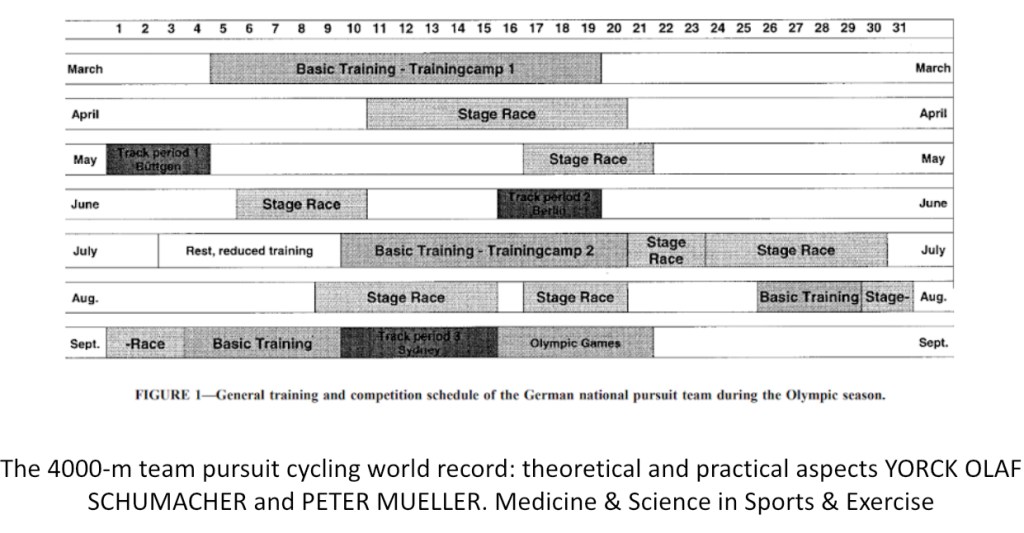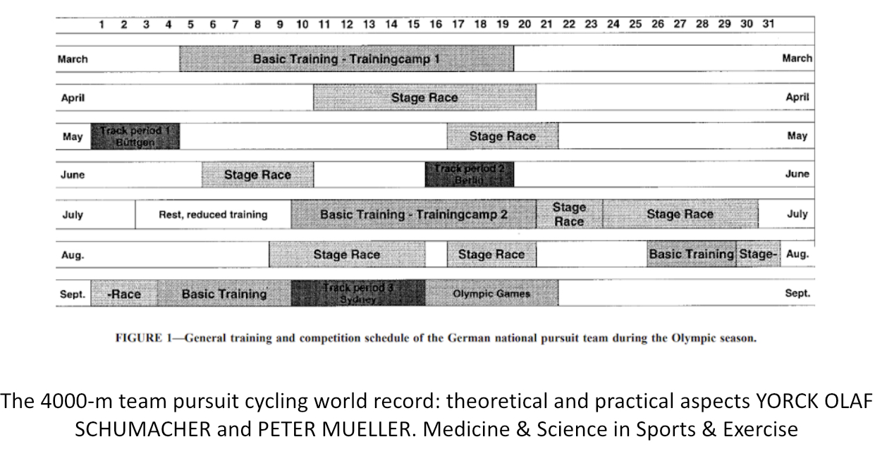 The integration of how best to develop the systems underpinning peak performance is the next challenge. Periodization models for cycling are well researched. (34) Reverse periodization models, block periodization models and pyramidal. (45). There is general agreement that the reverse periodization model tends to be used more now (35). Capacity is generally prioritized before repeatability. Often neuromuscular power is also prioritized early in a program. The polarized model then also prioritizes aerobic development. Added to this is the need to develop general strength in the gymnasium. What most elite programs now use is an interplay of blocks of training. Blocks of training may prioritize endurance and specific physiological capacities such as improving anaerobic thresholds or specific strength via hill training. Or specific Velodrome training periods with blocks of training targeting speed and power. It is difficult to find current reviews such as the 2000 review of the German Olympic Team Preparation for the 2000 Sydney Olympic Games (figure below). Nevertheless this approach is slightly different than the current Reverse Periodization models now. But once can see a double periodization model here. With road races merging into speed training in May and June. Now there is more frequent interplay between stages of Basic Training, Road races and Specific Speed Work.