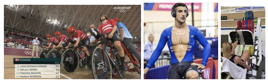Picture 1: Denmark Team Pursuit Team Picture 2: Italian team pursuit cyclist Picture 3: Australian Team Pursuit cyclist doing single leg press.