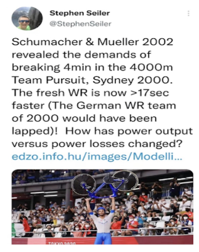 The world record is now 55.089km, and recently Dan Bigham from the UK broke Bradley Wiggins 1 hour record at sea level with 54.73km. Bigham is also an aerodynamics engineer and he made some interesting comments on social media recently. Dr Stephen Seiler posed the question. How much has power changed since 2000 when Germany won the Team Pursuit in 3:59?. Italy won in Tokyo with 3:42! Bigham did some calculations. He said there had been 25 watts increase (480 watts to 505 watts) and possibly a CdA increase of 20%. I have explained CdA later but simply put. His final comment was “aerodynamics improvements dominate”