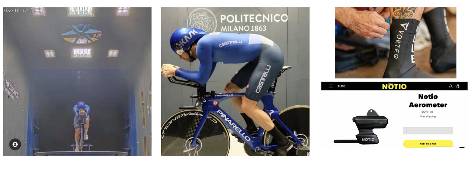 Wind Tunnels can be used to research equipment, skin tight gear and postures in an effort to get the same or extra speed with less power output. (49). But these calculations can now also be done in the field and on the velodrome with recent technology (50). Below are examples of a cyclist assessing equipment and postures in a wind tunnel. And an example of an aerometer which is now used in the field to assess aerodynamics in more specific environments.