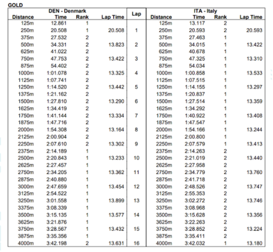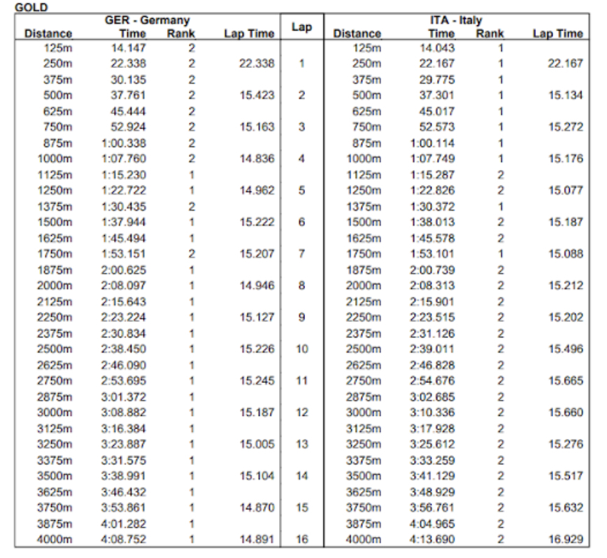 A recent trend is to have less transitions and for cyclists to spend more time at the front. Also another tactic has been to employ an anaerobically gifted power cyclist to start early and shield the other cyclists from the intense requirements of the start. A 2017 study (11), “Qualitative Video Analysis of Track Cycling Team Pursuit in World-Class Athletes” concluded that longer transitions are related to poorer team performance expressed by a slower end time. 77 races in the 2017 study were analysed in the leadup to the RIO Olympics. The best time in this study was 238 seconds. In contrast the best 3 teams in Tokyo Olympics did 222 seconds. The New Zealand team of 2021 would overtake the 2016 New Zealand team twice! Elite teams are now attempting longer pulls and less transitions. The trend now is to use less transitions, to minimize the impact of time wasted at changes. Within 3 to 4 years tactics changed dramatically.